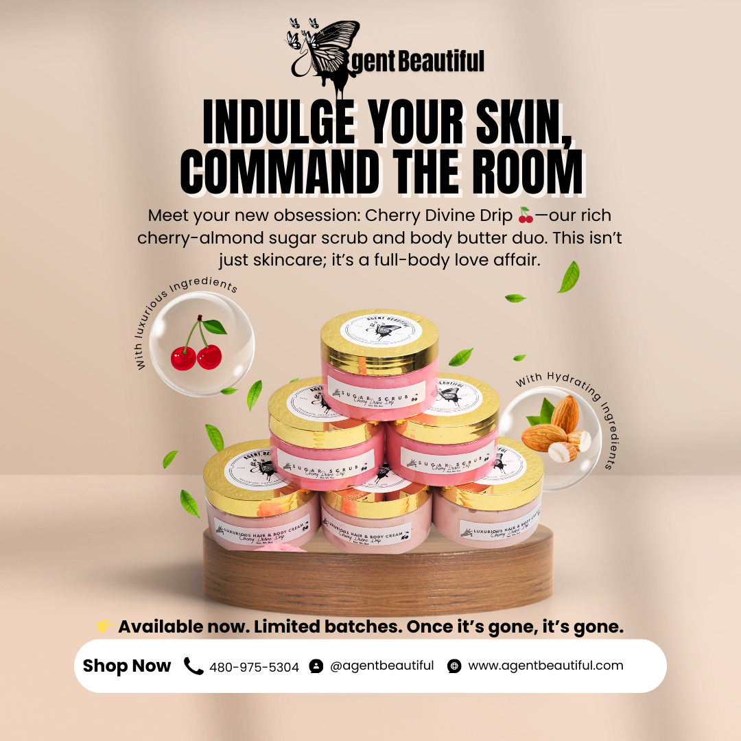 When the world feels unsteady, you need something steady of your own. After the scrub, you smooth on Cherry Divine Drip Body Butter β whipped, creamy, and laced with cherry-sweet temptation. It melts into your skin like silk, sealing in softness and reminding you that in the middle of chaos, you still get to feel divine. This isnβt lotion. Itβs permission to glow anyway.